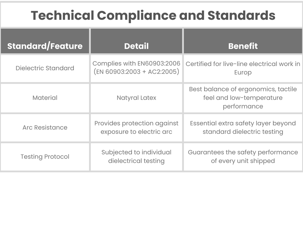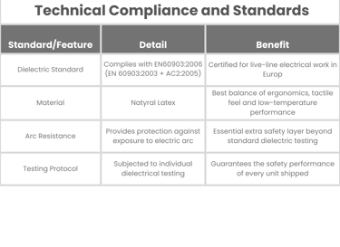 The ELECSAVE glove meets stringent European standards and uniquely integrates testing against electric arc effects—features often sold separately—providing comprehensive, certified protection at an optimal value.