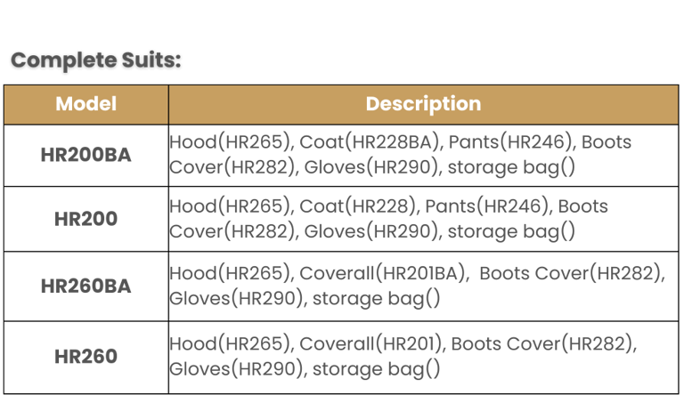 Multiple suit options available, including: hood, jacket/bib pants (coveralls), gloves, boot covers, portable product bag, and plastic box.